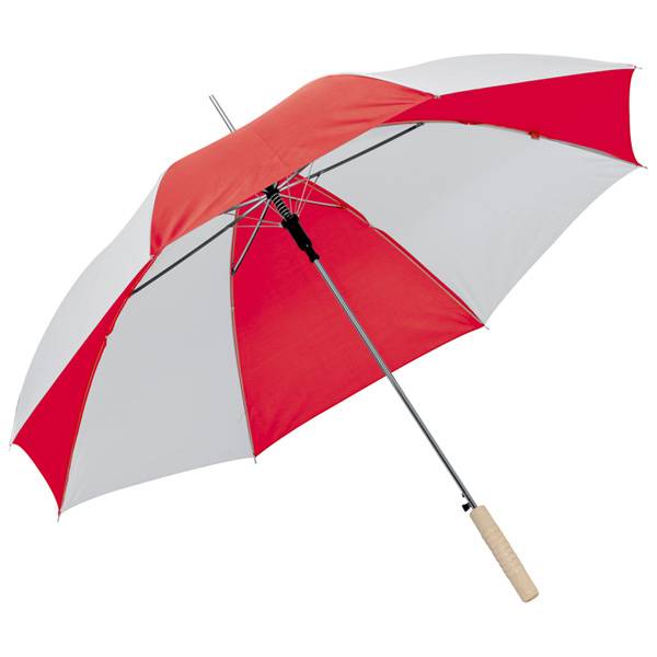 Zweifarbiger Automatikstockschirm mit geradem Holzgriff und Metallspitzen. Ihre Werbung drucken wir auf den unteren Teil eines weißen Segments.
