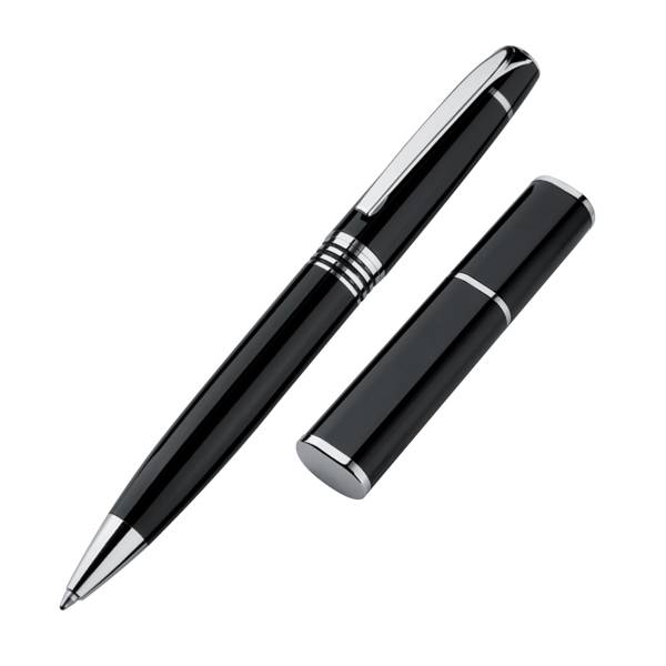 Edler Metall-Drehkugelschreiber mit blauschreibender Metall Großraummine und hochwertiger schwarzer Metallbox. Ihre Werbung lasern wir auf das Oberteil des Kugelschreibers rechts vom Clip.