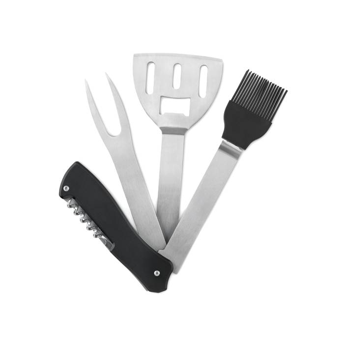 5teiliger Barbecue Küchenhelfer aus Edelstahl. Faltbar wie ein Taschenmesser. Inkl. Korkenzieher. Farbe: schwarz. Anfragen über info@takutrends.de