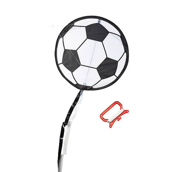 Lassen Sie den Ball fliegen... Großer Drachen in Fußballform und -optik mit 60 cm Durchmesser, 2 Bändern und einer 30 m langen Leine an einer Kunststoffspule.