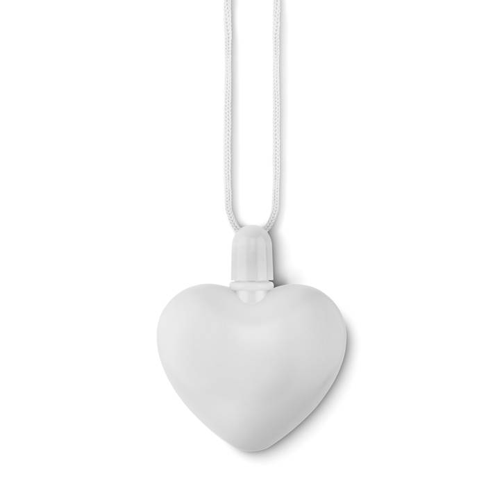 Seifenblasen in Herz-Form. Umhängeband mit Sicherheitsverschluss. Ideal für Hochzeiten. Füllmenge: 30 ml. Farbe: weiß. Anfragen über info@takutrends.de