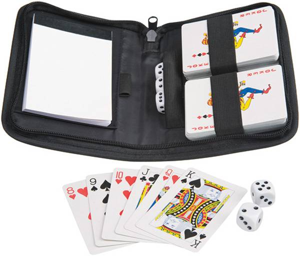 Zwei Kartenspiele, 5 Würfel, Schreibblock und Bleistift in einem Etui mit RV und Geschenkkarton. Nicht für Kinder unter 3 Jahren geeignet. Erstickungsgefahr wegen verschluckbarer Kleinteile.