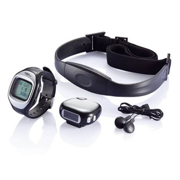 Set inkl. Pedometer mit FM Radio mit Kopfhörer, Pulsmessgurt und Uhr mit präzisem Pulsmesser, visuellem und akustischem Signal, Benutzerprofilfunktion inkl. Geschlecht, Gewicht, Trainingsintensität und Zielpuls, Kalender, Stoppuhr, 2 Countdown-Zähler, Wecker, wasserdicht bis zu 30m.