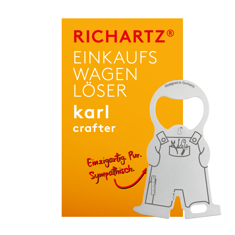 Einkaufswagenlöser Karl Handwerker. Der sympathische EINKAUFSWAGENLÖSER überzeugt durch seine Branchen-Gravur, seine ultraflache und handliche Form. Durch die einzigartige Kombifunktion aus Einkaufswagenlöser und Kapselheber und weitere nützliche Funktionen wird er schnell zum unverzichtbaren Begleiter.