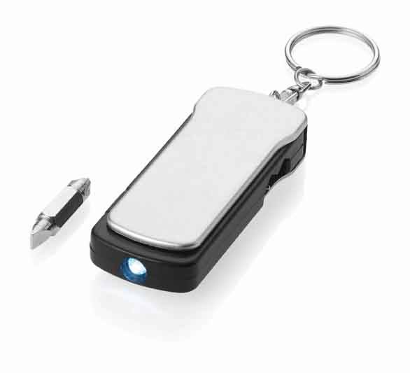 Mit Schlüsselring und zwei Schraubendrehern, die magnetisch in der Halterung platziert werden können, inkl. Knopfzellen.