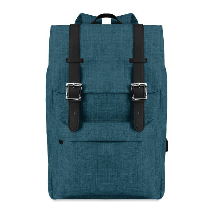 Rucksack mit 15" Laptop-Fach und USB-Ladekabel. Magnetischer Schnappverschluss und Frontfach mit Reißverschluss. Gepolsterte Schultergurte. Zweifarbiger 600D Polyester. Farbe: blau. Anfragen über info@takutrends.de