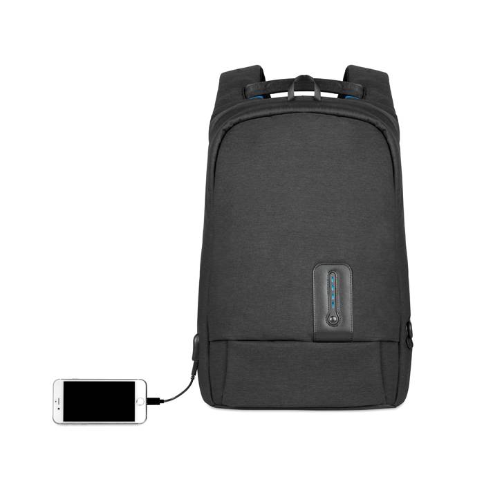 Rucksack mit abnehmbarer Powerbank 8000 mAh, inkl. wasserfestem AC Adapter-Ladeanschluss und Batteriestandsanzeige. Innenliegende Reißverschlüsse - somit diebstahlsicher. Großes Hauptfach mit Laptop- und Tablet-Fach. Gepolsterte Schultergurte. Smartphone Halterung am Gurt. 300D Nylon. Farbe: schwarz. Anfragen über info@takutrends.de