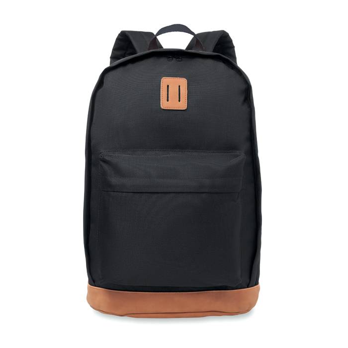 Rucksack aus 1000D Polyester mit einer Außentasche. Kleine Reißverschlusstasche auf der Oberseite. Farbige PU Details. Farbe: schwarz. Anfragen über info@takutrends.de