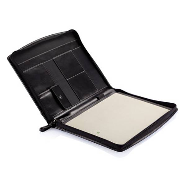 Portfolio mit Reißverschluss, Kunststoff, innen Einschub mit Reißverschluss, 7 flache Einschübe für USB und Stift, inklusive A4 Schreibblock mit beigem Umschlag und 20 Blättern aus recyceltem Papier, mit grünem Recycle-Logo, konfektioniert in schwarzer Geschenkbox.