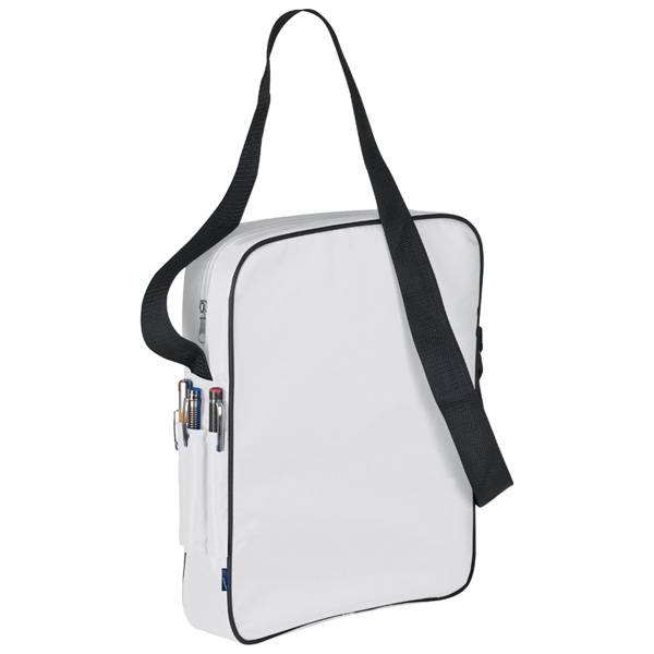 Der Klassiker - Umhängetasche aus Polyester mit verstellbarem Schultergurt und drei Kugelschreibersteckfächern außen an der Seite. Die großen Außenseiten bieten viel Platz für Ihren Werbeaufdruck.
