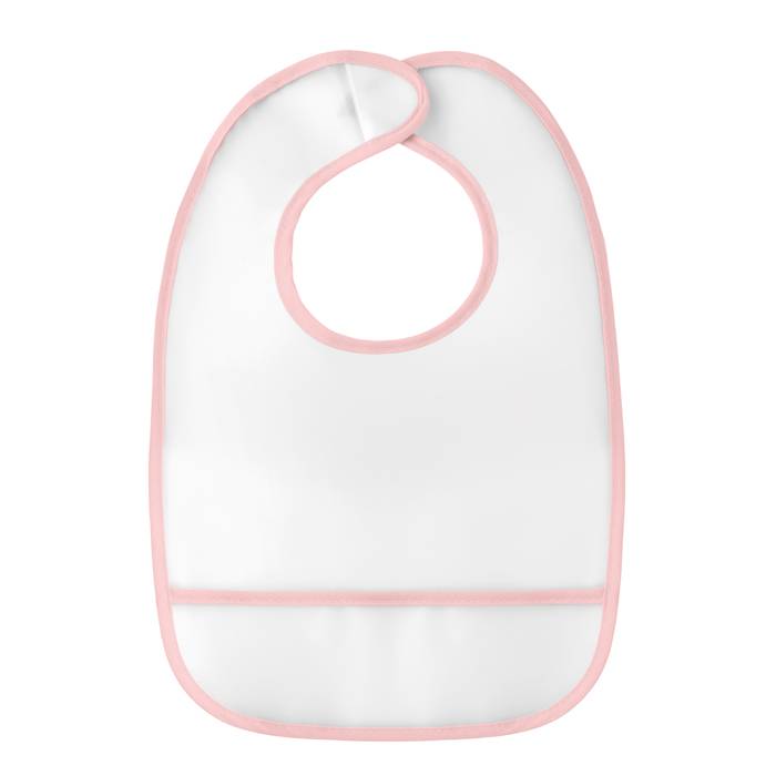 Baby-Lätzchen. Kleine Fronttasche. PEVA mit farbigem Polyester-Saum. Farbe: rosa. Anfragen über info@takutrends.de