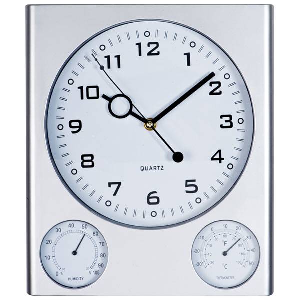 Wanduhr "Trio" mit Hygrometer und Thermometer aus Kunststoff. Ihre Werbung drucken wir auf das Feld unterhalb der Sechs zwischen den beiden Anzeigen.