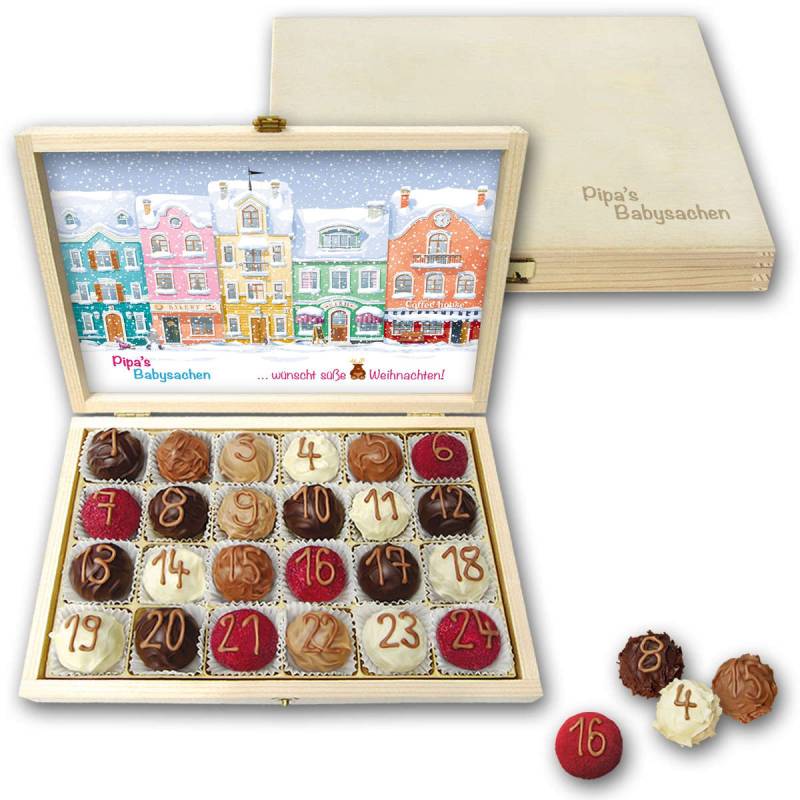 Trüffel Adventskalender als Werbegeschenk Holzkiste mit Firmenlogo