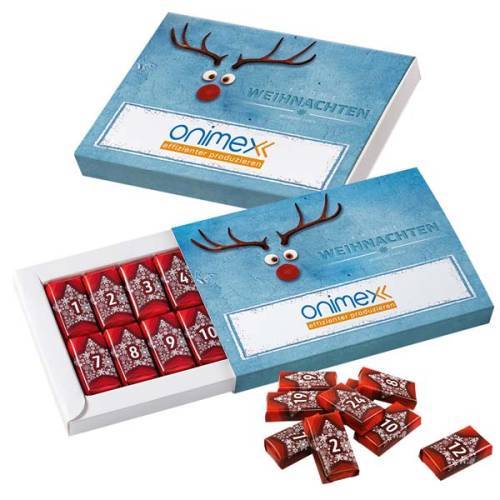 Mit dem neuen Schuber-Adventskalender verschenken Sie pure Vorfreude auf Weihnachten. Den hochwertigen Weihnachts-Werbebotschafter befüllen wir für Sie mit 24 durchnummerierten 4,6g Schokoladen-Naps aus feinster 35%iger Vollmilchschokolade, die wir frisch für Sie in unserer hauseigenen Chocolaterie aus bestem Fairtrade-Kakao conchieren und gießen. Der Clou: Die edlen Täfelchen werden in FSC-zertifizierte Papierfolie kuvertiert. Somit werbenSie mit dem auffälligen Schuber-AK nicht nur noch genussvoll, sondern garantiert nachhaltig. Als Motiv stehen Ihnen eine Vielzahl an kreativen Standardmotiven zur Verfügung, die wir für Sie noch Ihren Vorgaben mit Ihren Logo und Ihrer Werbebotschaft bedrucken.