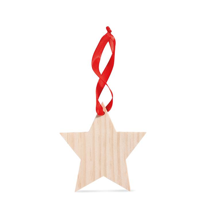 Anhänger aus Holz in Form eines Sterns. Mit rotem Aufhängeband. Farbe: holzfarben. Anfragen über info@takutrends.de