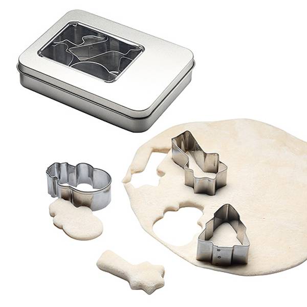 Bestehend aus 6 weihnachtlichen Edelstahlformen zum Ausstechen von Plätzchen. Stern mit Schweif, Glocke, Schneemann, Engel, Christbaum und Lebkuchenmann sind in einer Metallbox mit Sichtfenster edel verpackt.
