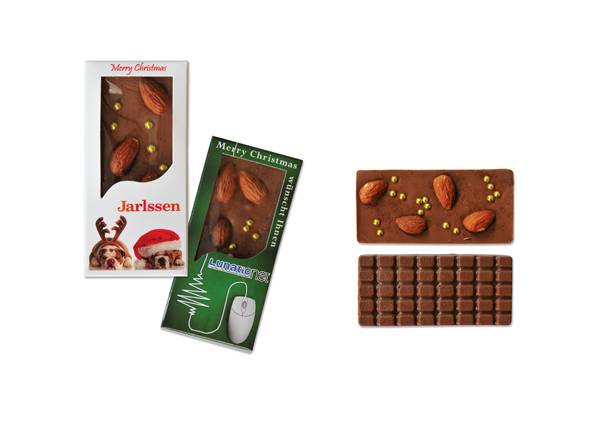 Weihnachtsschokolade aus Vollmilch mit Zimt, Mandeln & Goldperlen in Folie verpackt. Eingelegt in Kartonumschlag individuell im Digitaldruck bedruckt.