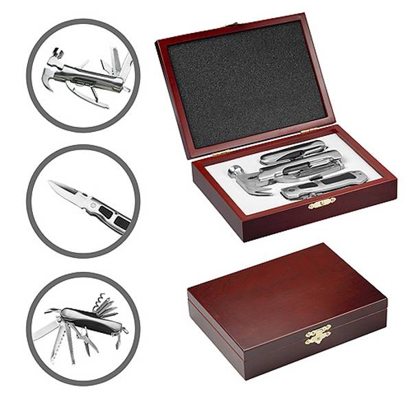 3-teiliges Set in edler Holzkiste mit Schaumstoffeinlage. Mit einem Huntermesser, einem Taschenmesser mit 11 Standardfunktionen und einem Multitool.