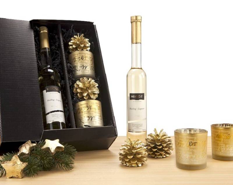 Ein hübsches Geschenk mit 2 Teelichtgläsern ‚Merry Christmas‘, incl. goldenen Dekotannenzapfen und leckerem Likör (0,35 l, sortiert). Verpackt in schwarzer Schmuckwelle
