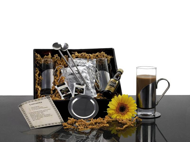 An kalten Abenden ein heißer Genuss: Lumumba, das ist heiße Schokolade mit etwas Rum - kalt geht es aber auch! In diesem Set sind dafür 2 Schokoladengläser, 2 Trinkhalmlöffel, 2 Tütchen Trinkschokolade, 2 Schokotäfelchen, 1 Fläschchen Rum und 1 Rezept. In schwarzem Geschenkkarton mit Dekomaterial und durchsichtigem Deckel.