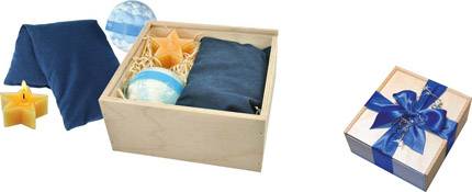 Relaxing Präsent. Inhalt Körnerkissen, ca. 12 x 26 cm, Badekugel und Sternlicht in Holzkiste