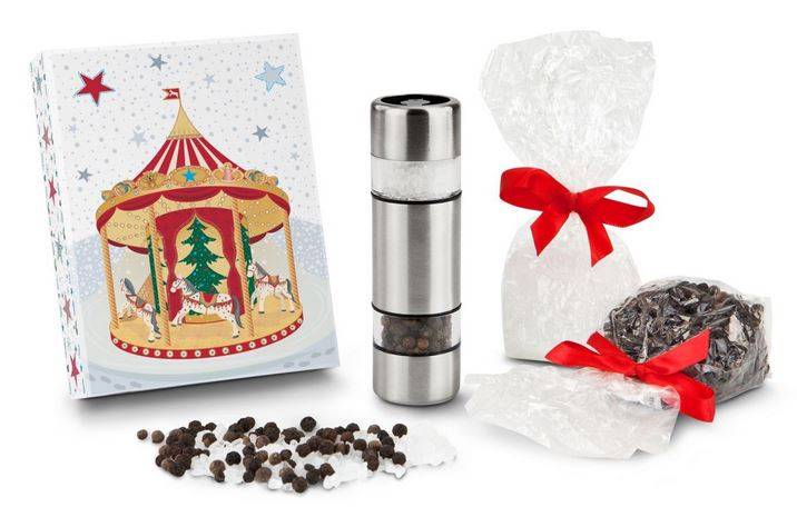Weihnachtsduett Salz & Pfeffer als Werbegeschenk für Kunden und Mitarbeiter. Salz & Pfeffer im Miniformat. Klein, fein und immer griffbereit – die ROMINOX® Mühle mit zwei getrennten keramischen Mahlwerken für Salz und Pfeffer ist direkt kombiniert mit je einem Tütchen Salz (ca. 80 g) und Pfeffer (ca. 50 g) – einfach einfüllen und auf den Tisch stellen. Verpackt ist das Set in einem weihnachtlichen Geschenkkarton.
