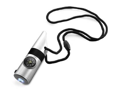 Multifunktions-Survival-Werkzeug bestehend aus Pfeife, Kompass, LED-Lampe und Spiegel, inklusive Kordel mit Sicherheitsverschluss und Batterien