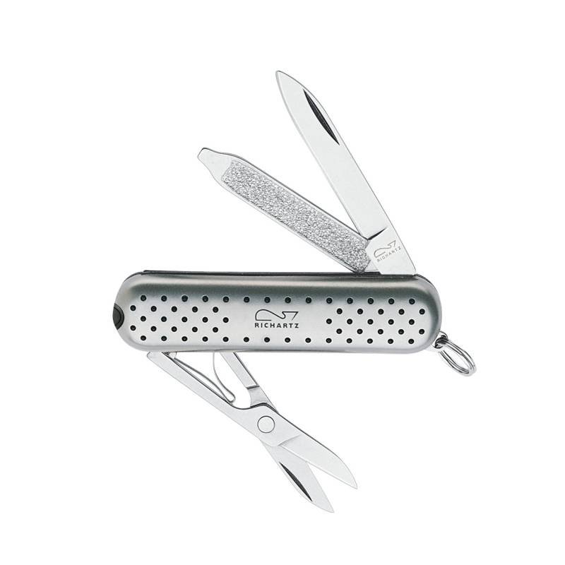 STRUKTURA classic von RICHARTZ verbindet moderne Technik, perfekte Funktionen und ausgezeichnetes Design. Die hochwertigen Edelstahlgriffe sind mit einermarkanten rutschsichernden Noppenstruktur versehen. Ausstattung: Klinge, Nagelfeile mit Schraubendreher, Schere, Pinzette, Zahnstocher, Ring.